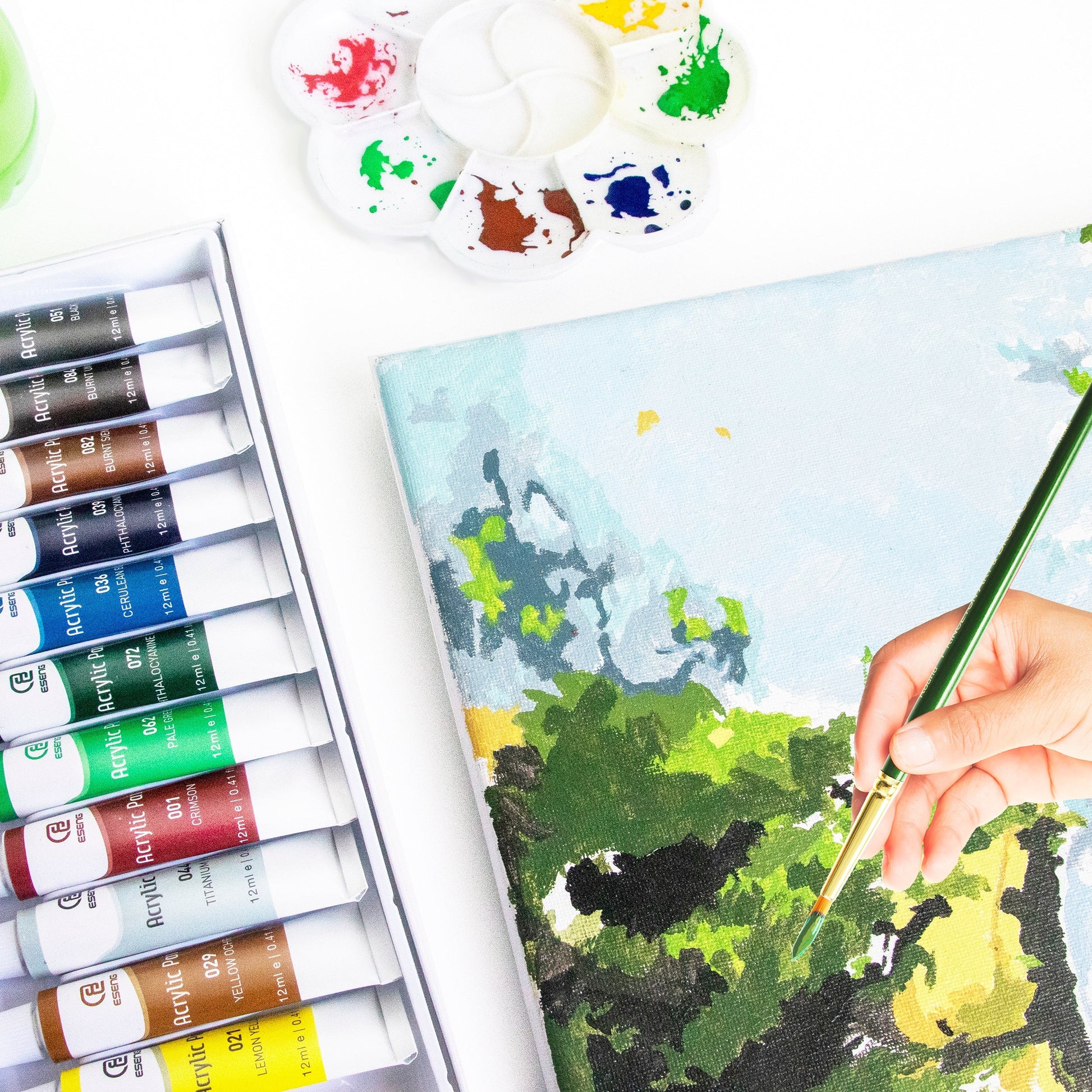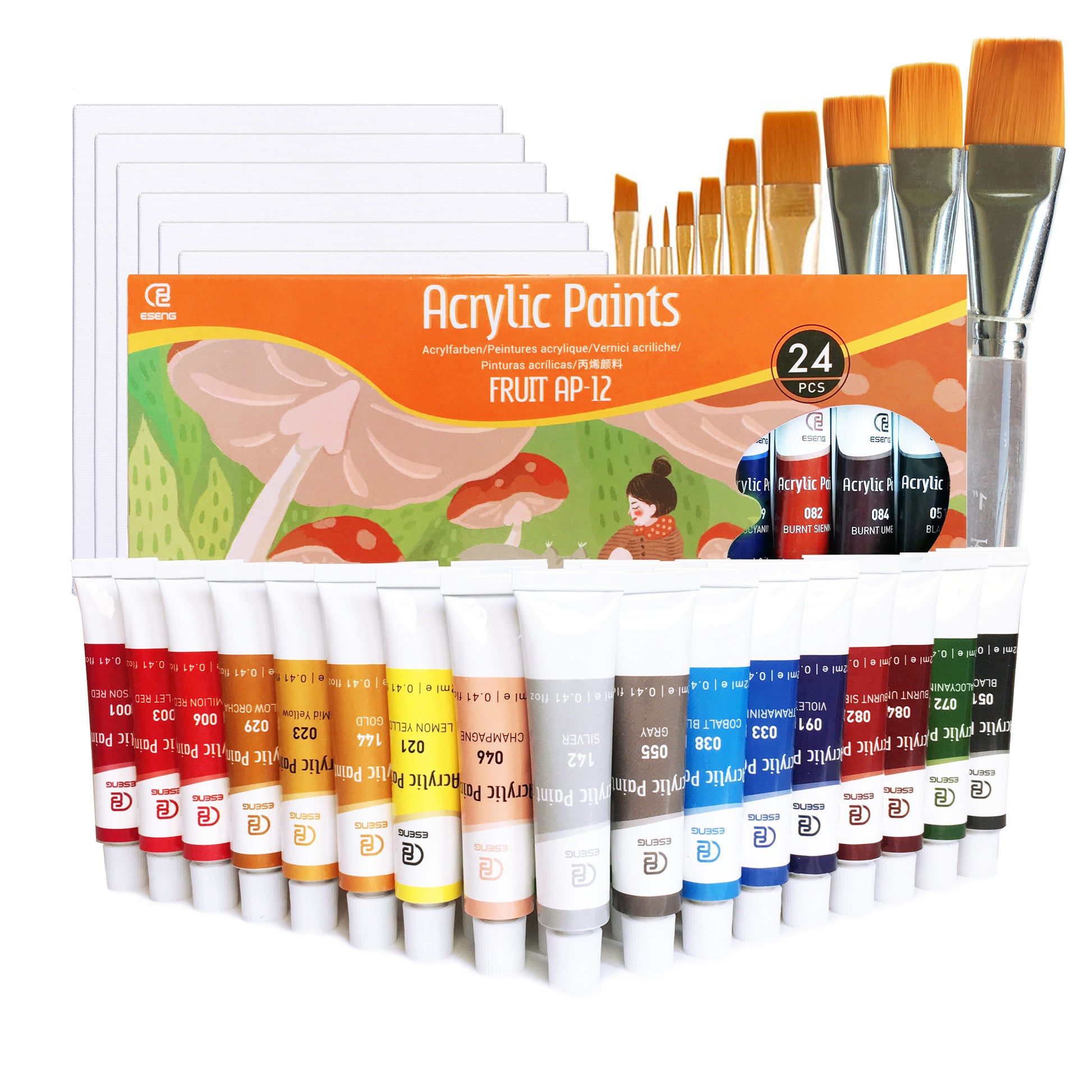 - ESENG® Premium Acrylfarben Set-2 ist in 24 klassischen Farben zu je 12 ml, dazu gibt es 10 Pinsel in verschiedenen Größen und 6 Leinwände, erhältlich und eignet sich für Studenten, Malbegeisterte und Profis. Durch die geringe Größe und das geringe Gewicht sind diese Produkte leicht zu transportieren.